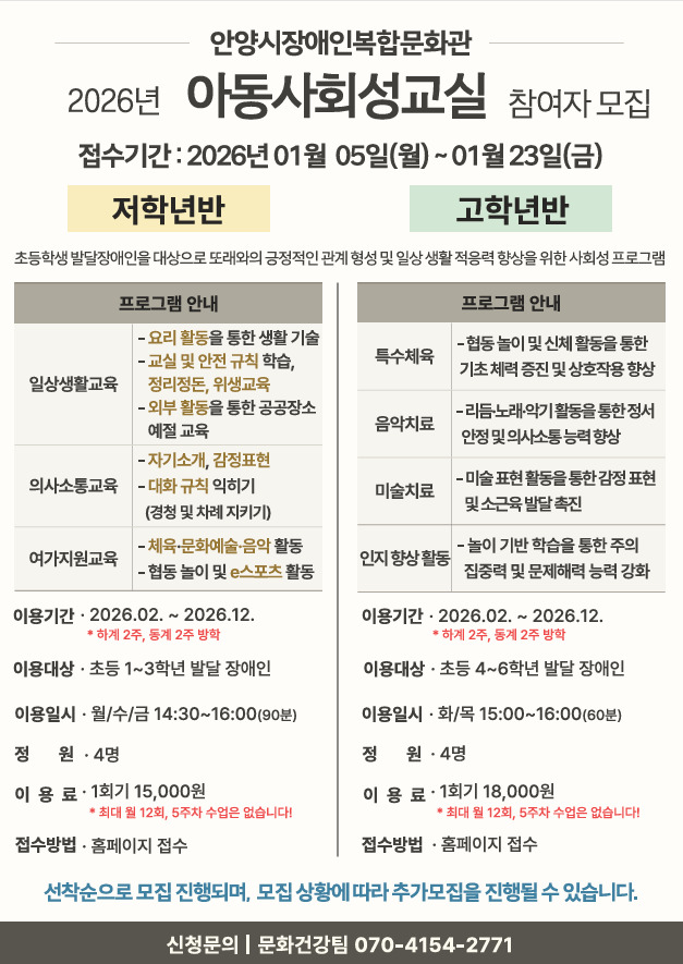아동사회성교실(고학년반-초등 4~6학년) 접수중