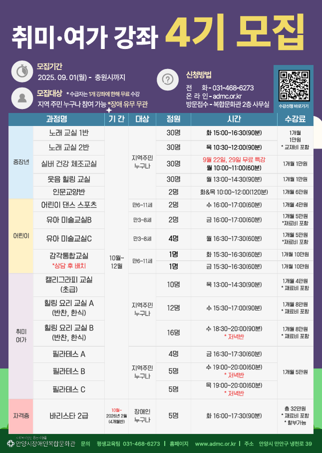 취미 여가 강좌는 월 단위 프로그램으로, 결석할 경우 이용료는 환불되지 않습니다.