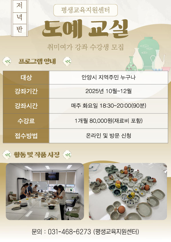 강의내용- 흙을 활용한 자유로운 성형 및 다양한 기법 실습 - 생활 속에서 활용 가능한 머그컵, 접시, 그릇 등 제작