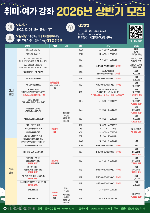 취미 여가 강좌는 월 단위 프로그램으로, 결석할 경우 이용료는 환불되지 않습니다.