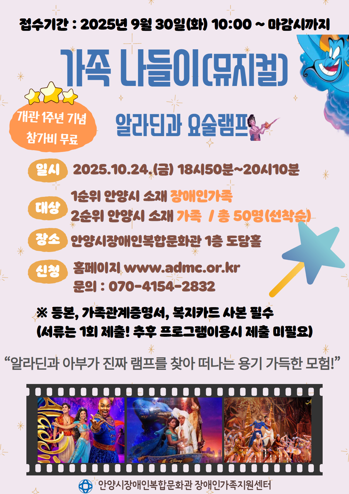 알라딘과 요술램프 ♡뮤지컬공연 신청♡ 1인당 1접수 예시) 가족 구성원 3명 신청하는 경우-> 3명 이름 별 3번 접수 필요! ★안양시★ 소재 장애인 가족 / 비장애인 가족
