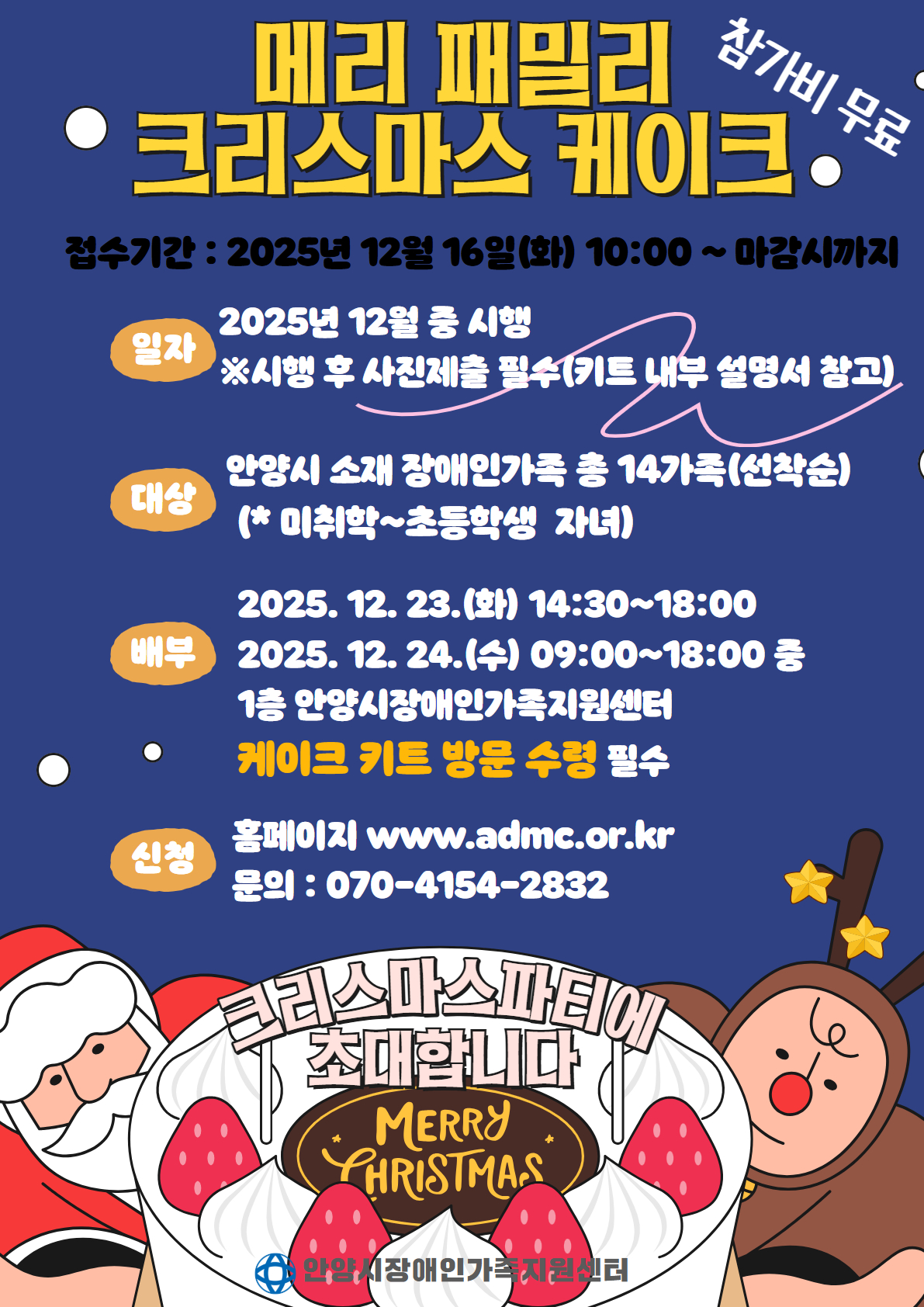 * 미취학~ 초등학생 자녀를 둔 안양시 소재 장애인 가족(총 14가족) * 12. 23.(화) 오후 ~ 12. 24.(수) 키트 배분 방문 수령 필수! (프로그램 진행 후 사진제출 이메일 필수!)