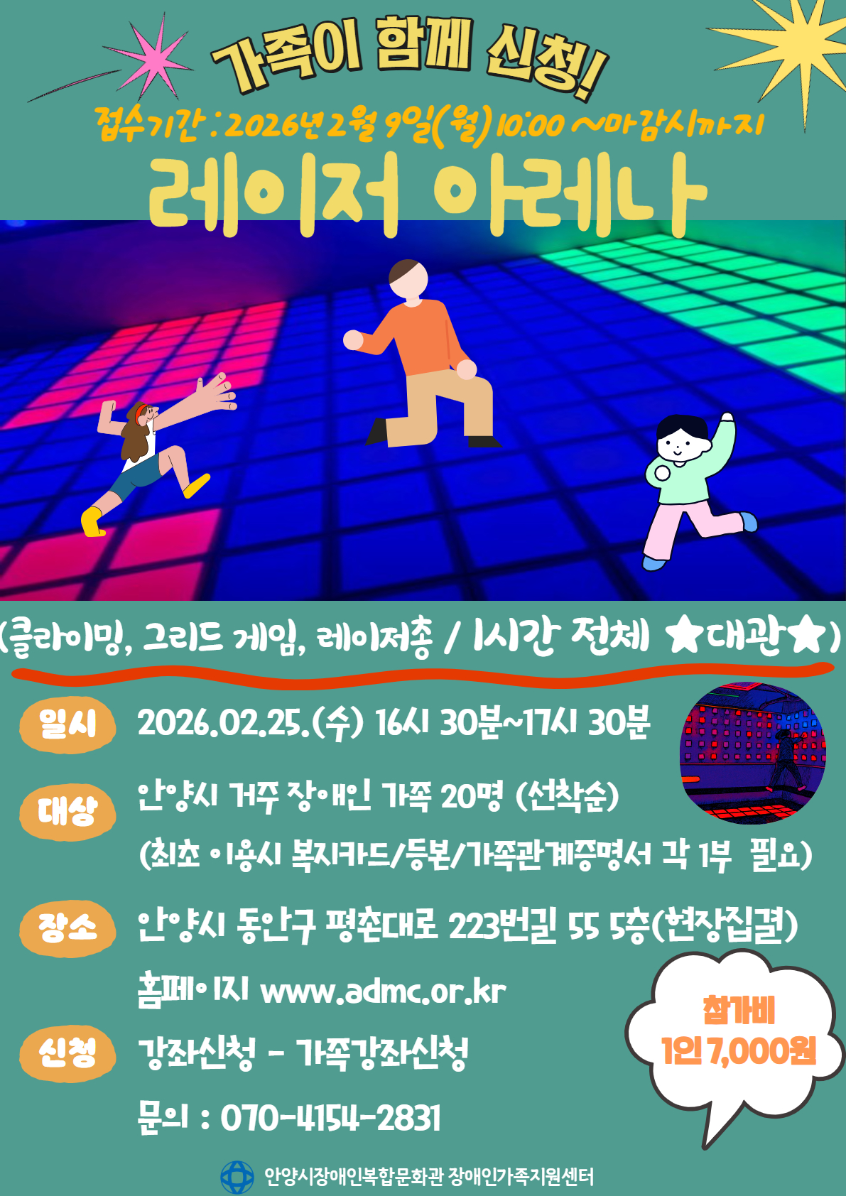 ★장애인 가족★이 반드시 같이 참여해야합니다! ♡가족이 함께 참여하는 프로그램입니다♡ 1인당 1접수 예시) 가족 구성원 3명 신청하는 경우-> 3명 이름 별 ★3번 접수★ 필요! ★현장집결★ 당일 16시 30분까지 '레이저 아레나'로 방문하시면 됩니다. (1시간 전체 대관) 주차는 불가하다고 하니, 주변 공영주차장을 이용하시기 바랍니다~ ★마감 후 참가비 입금 개별 연락 드립니다. (참가비 1인당 7,000원)