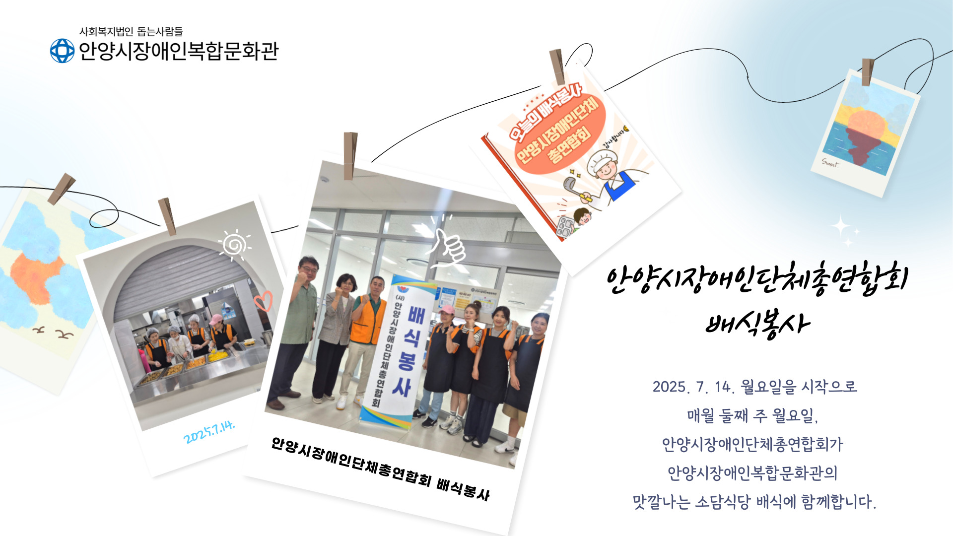 2025. 7. 14을 시작으로 매월 둘째주 월요일 안양시장애인복합문화관의 소담식당에서