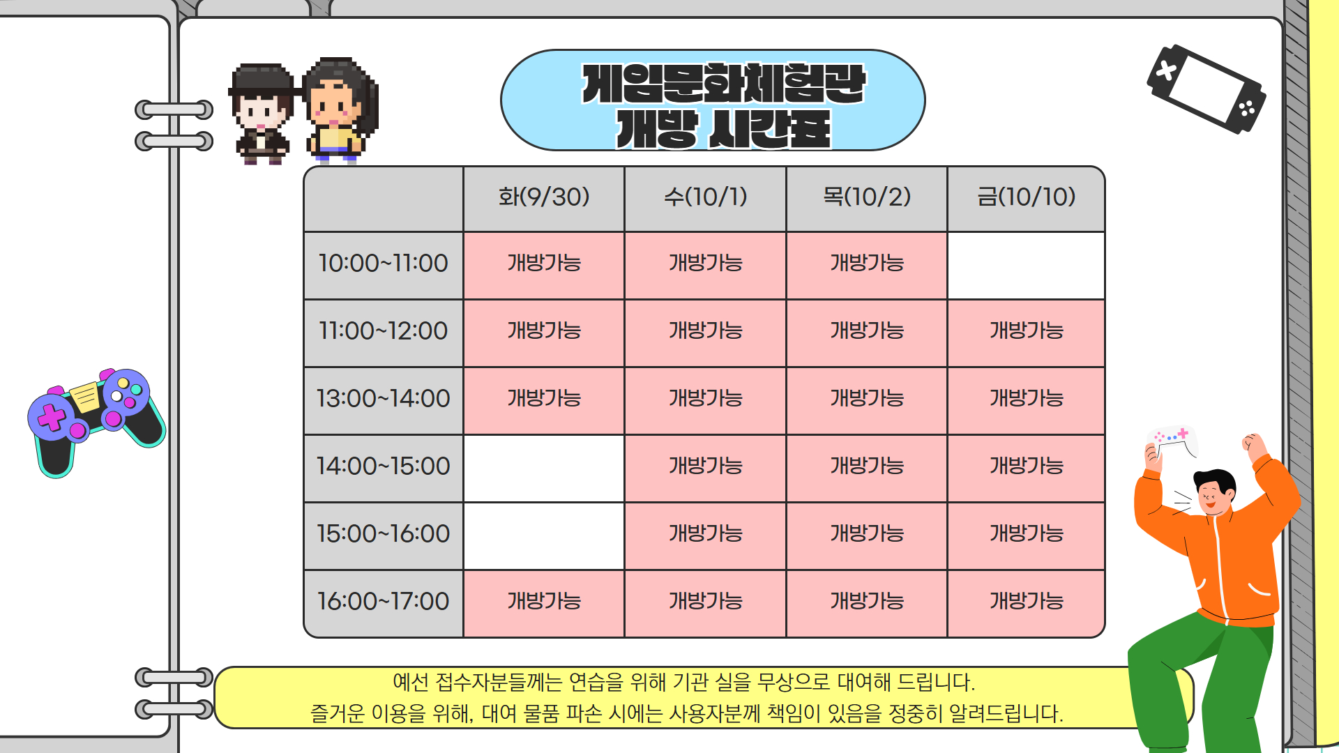 개관 1주년 E-sport 대회에 참여하는 선수 여러분의 연습을 지원하기 위해 붙임의 시간표를 공유드리니 아래의 주의사항을 참조하시어 의미있는 연습시간 되시기를 바랍니다.