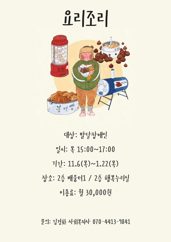 강의내용일상생활과 아주 밀접한 요리! 내가 좋아하는 음식을 내가 직접 준비하고 만듭니다. 레시피 정리부터 장 보고 요리하고 뒷정리까지 스스로 해봅니다.